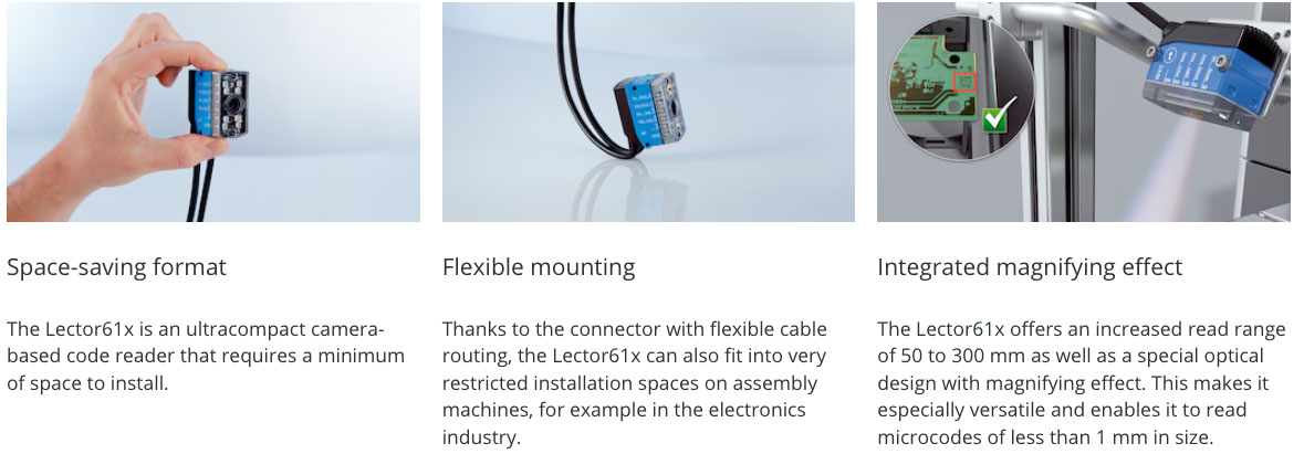 Saves space but not performance: The compact construction including connector with flexible cable routing, and the special optical design of the Lector61x make it suitable for a variety of applications in production lines where installation space is at a premium.